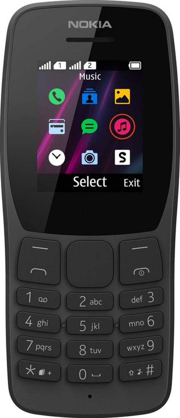 Nokia 110. Vormfactor: Rechthoek. SIM-kaart-capaciteit: Dual SIM. Beeldschermdiagonaal: 4,5 cm (1.77"), Resolutie: 120 x 160 Pixels. Resolutie camera achterzijde (numeriek): 0,3 MP. FM-radio. Capaciteit van de accu/batterij: 800 mAh, Standby time (2G): 444 uur.