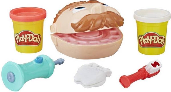 Inclusief speelgoed voor de tandarts, boor, tandvorm, tandenborstel en 2 blikjes Play-Doh Brand Modeling Compound.